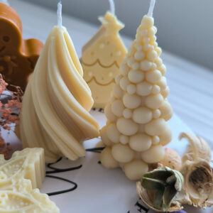 Narejena iz naravnega sojinega in čebeljega voska, brez parafina. Dodan je bombažen stenj. Vlivana ročno.